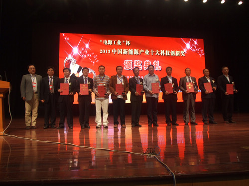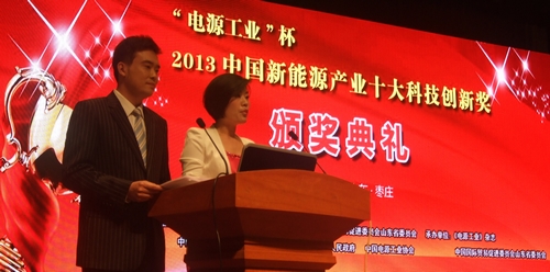 2013中國新能源產(chǎn)業(yè)十大科技創(chuàng)新獎頒獎典禮于10月19日在山東棗莊會展中心隆重舉行,工信部節(jié)能與綜合利用司資源綜合利用處處長黃健忠、棗莊市政府副市長張兵與中國電源工業(yè)協(xié)會理事長季國平、北京大學(xué)教授其魯分別向獲得十大科技創(chuàng)新獎及十大管理創(chuàng)新獎的企業(yè)或企業(yè)家頒獎。